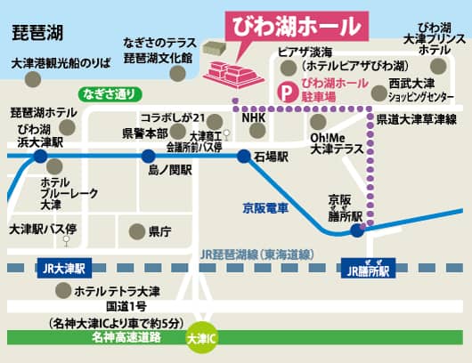 京都駅からJR琵琶湖線(東海道本線)の彦根・米原方面行きにご乗車いただき、大津駅もしくは膳所駅で下車してください。