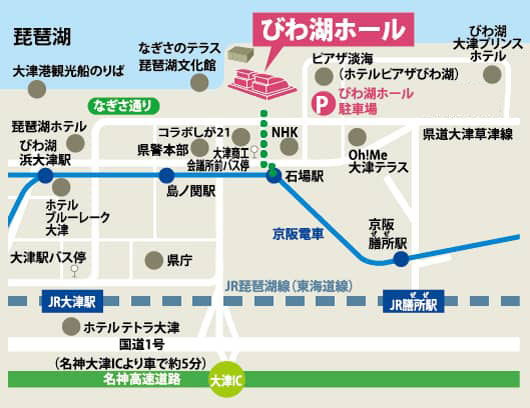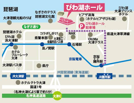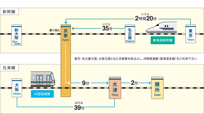 京都駅からJR琵琶湖線(東海道本線)の彦根・米原方面行きにご乗車いただき、大津駅もしくは膳所駅で下車してください。
