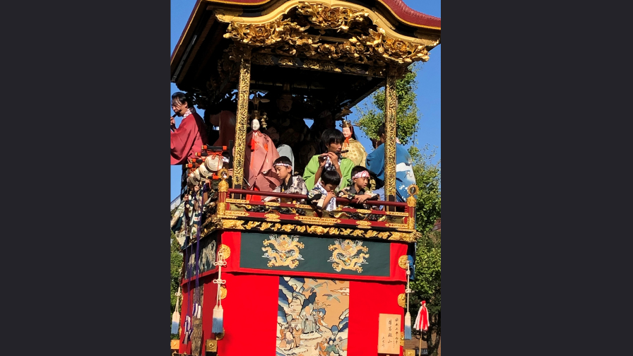 本日お囃子を披露させていただく月宮殿山は、安永五年(1776年)に鳳凰臺山として創建され、寛政三年(1791年)に月宮殿山となりました。名前の由来は能楽の喜多流「月宮殿」に因んだカラクリを演じるところからで、別名「鶴亀山」とも呼ばれています。精緻な錺金具や「トロイ陥落図」の見送り(現在復元品を使用)を持つ豪華絢爛な月宮殿山を是非、本祭巡行でご覧下さい。