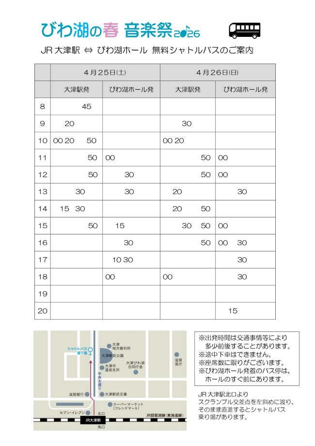 「びわ湖の春 音楽祭2026」 JR大津駅⇔びわ湖ホール直行 無料シャトルバスのご案内