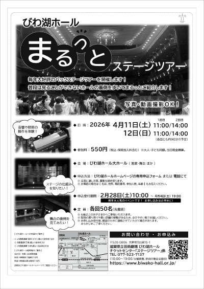 - 参加申し込みの際に取得した個人情報につきましては、「まるっとステージツアー」に関する業務にのみ使用し、この目的以外には使用いたしません。びわ湖ホール個人情報保護規定につきましては、当館のプライバシーポリシーをご覧ください。