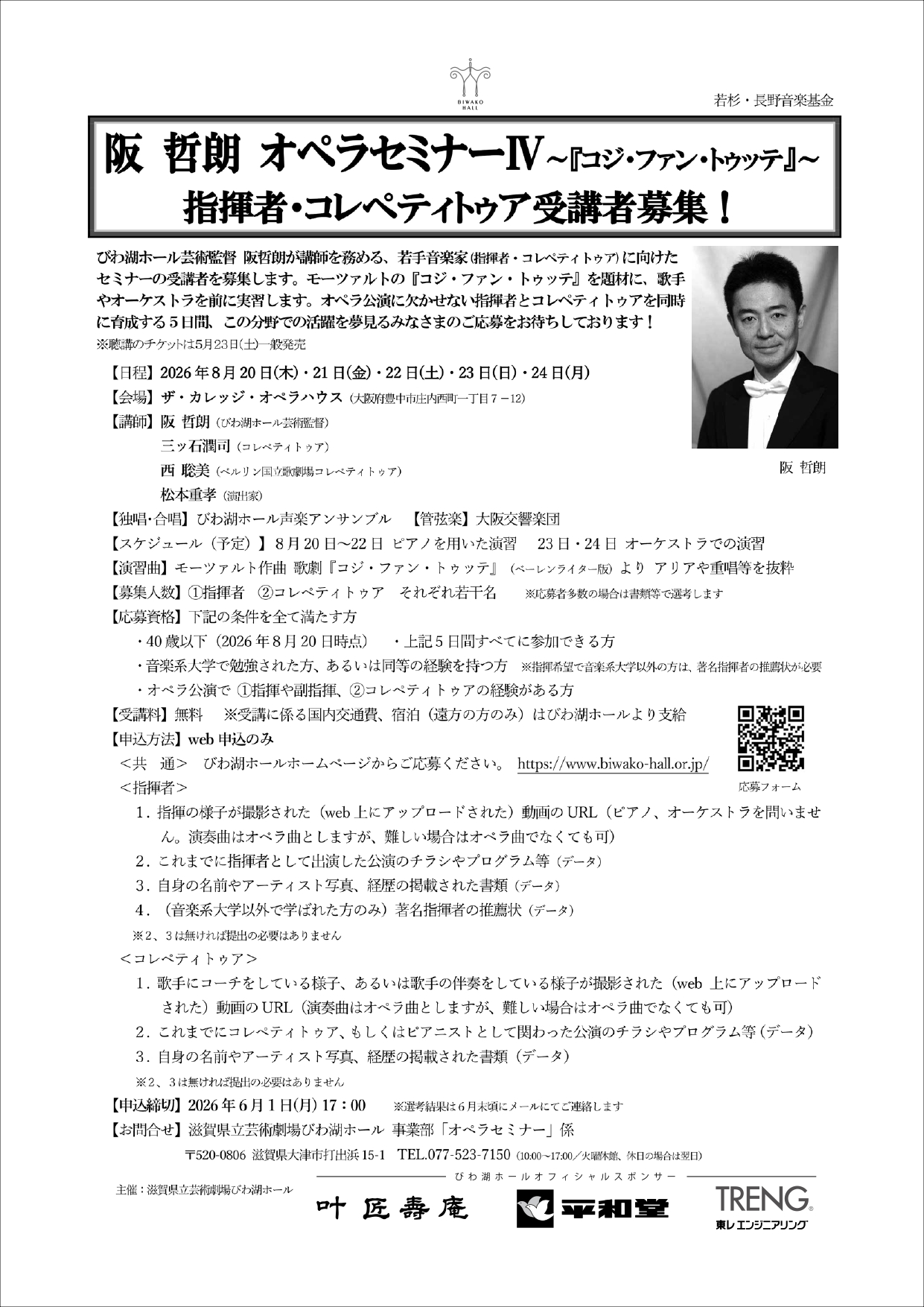 びわ湖ホール芸術監督の阪哲朗が講師を務めるオペラセミナー。公募の指揮者、コレペティトゥアを対象として、指導の様子を広く一般に公開します。
